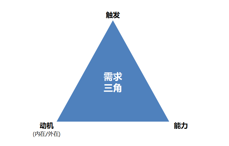 按照福格行为模型B=MAT理论来看,一个人必须要同时满足以下三点才会有所行动:B是Behavior行为,M是Motivation 动机,A是Ability能力,T是Triggers触发,我们姑且称之为"需求三角"。