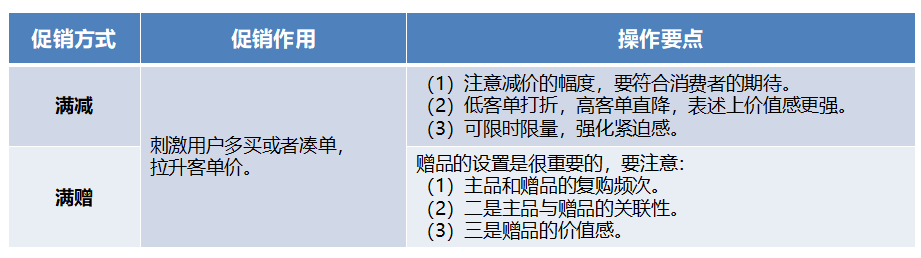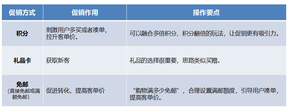 订单和支付维度的促销,包括免邮、满减满赠、积分、代金券、礼品卡等,主要围绕以下两个目标来进行:一是提高转化率,诱导下单和支付,坚定用户的购买行为,减少跳出率,;二是尽可能的提高客单价。
