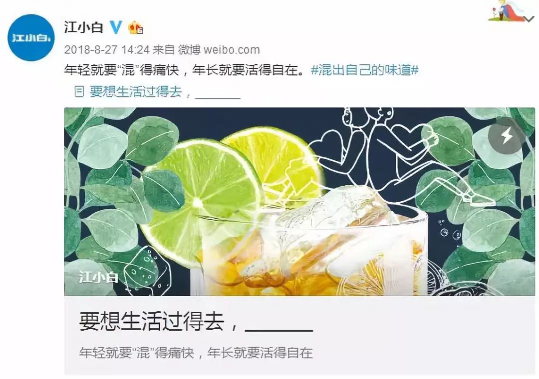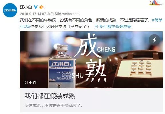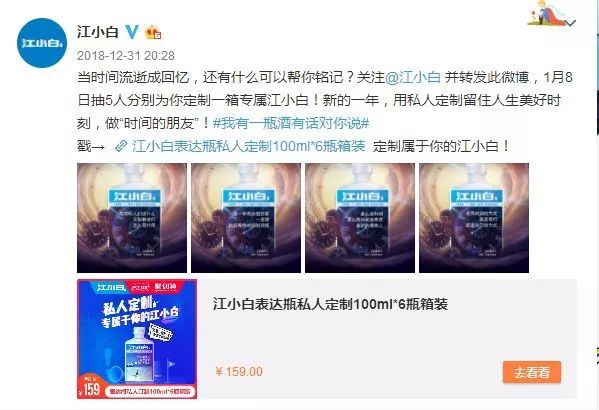 2018年的江小白也没有盲目追热点,好多热点都没有去追,而是注重从品牌和产品两方面来表达自己的生活态度,用种各样的营销热点来表达自我。