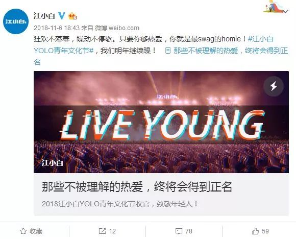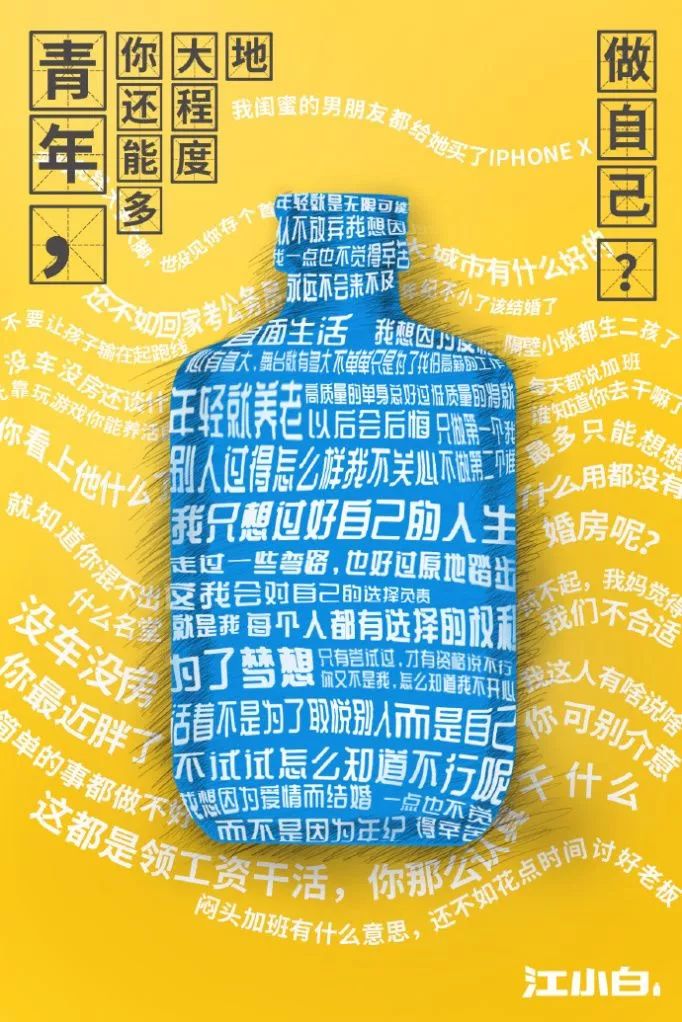 2018年,江小白还举办了自己的青年文艺节,花了大半年的时间,从各大城市,从南走到北、从白走到黑,走遍了整个中国。所谓态度和热情,大GAI如此!