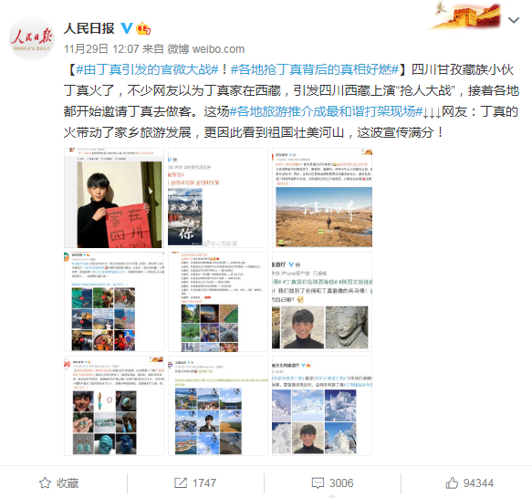 比如,四川文旅官微推出话题#其实丁真在四川#话题,晒起了四川山川风景,各大地方官微开始邀请丁真去做客…….随着丁真效应的发酵,丁真事件还列入成为2020年十大旅游事件。