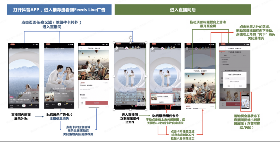 | 展示逻辑 | 原生直播间内的实时内容在feed信息流中作为广告创意内容直接展示 | Feed信息流页面播放视频广告素材(头像带呼吸灯) |
