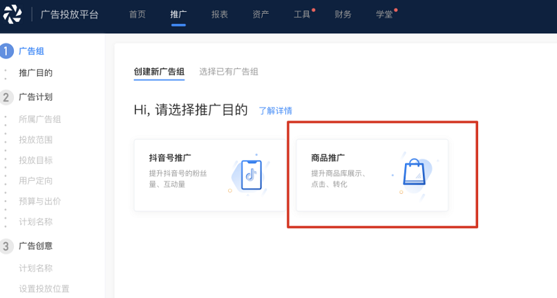 选择「推广目的」,推广目的选择"商品推广"或者"抖音号推广"