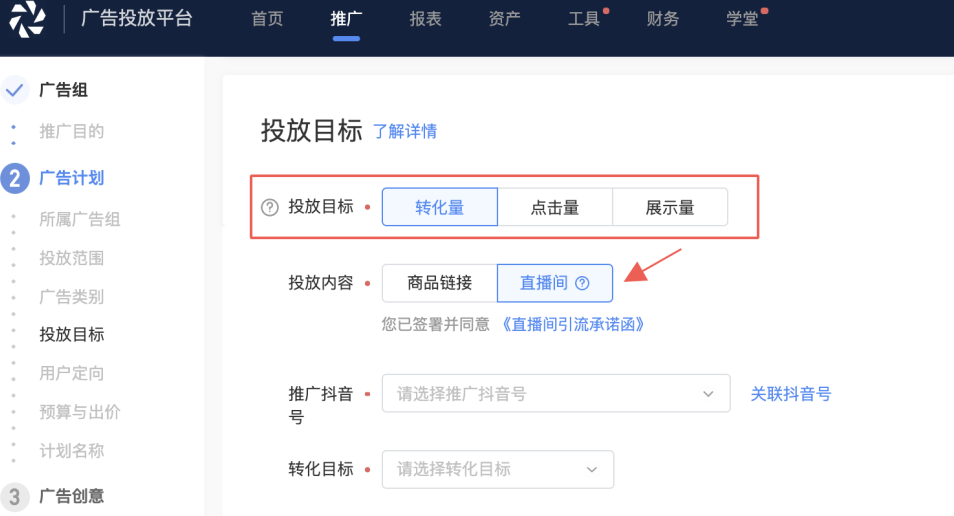 Q:如果想在直播间做转化,推广目标选什么更合适?