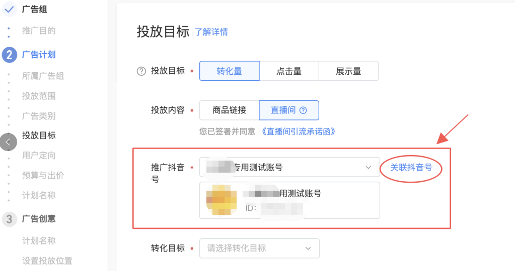 推广抖音号:只可选择已绑定的抖音号。若之前没有将广告帐户与抖音号绑定,请点击右侧"关联抖音号"按钮 ,按照操作流程先行绑定抖音号,然后选择对应的抖音号。