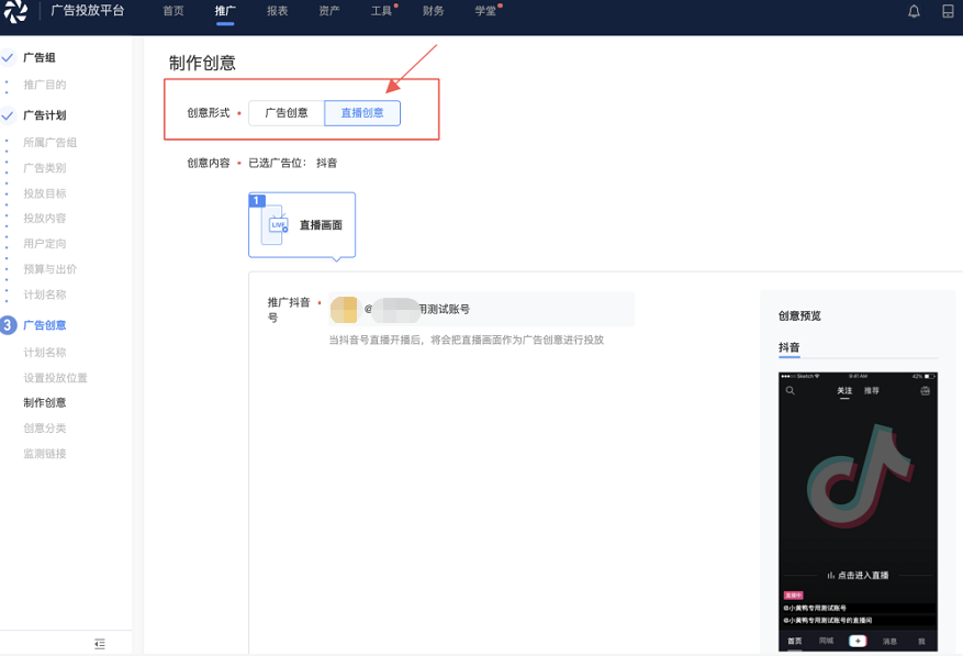 即短视频引流直播间样式,选择"广告创意"后,则按照短视频引流的常规创意制作方式上传即可,如下图: