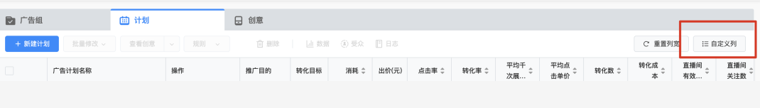 点击"推广"--点击"自定义列"