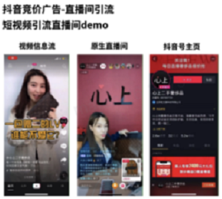 字节旗下特推出:抖音引流直播间的工具----FEED直投直播间,抖音竞价广告-直播间引流,其实就是通过抖音账号展示直播,直播间在内容呈现上,更立体、生动、丰富,通过主播现场同用户实时互动,快速为用户提供有效信息,刺激用户转化或消费。