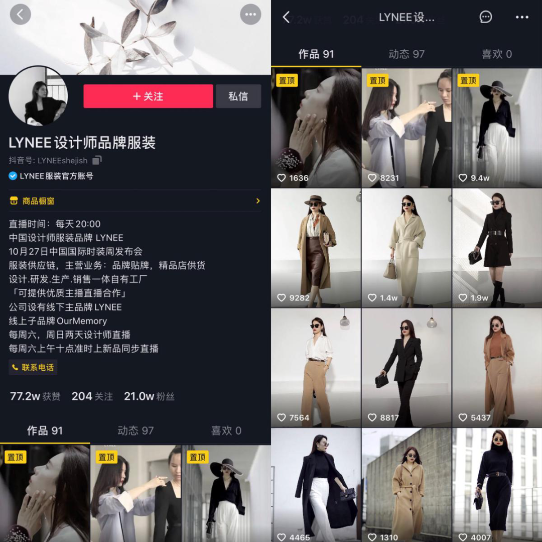 Lynee是一位独立服装设计师,她喜欢极简的穿衣风格,在直播时不擅言语,但却吸引了一大批一二线独立成熟白领女性,很多人愿意模仿她的穿搭来打造自己的人设。Lynee在抖音上积累了23万粉丝,这个数量并不“耀眼”,却有着极高的转化率。追求品质的她,服装销售的客单价在2000元以上,这样的商品在电商平台上很难找到适合的买家,但是在抖音上,不到一个季度她的小店就实现了5倍增长。