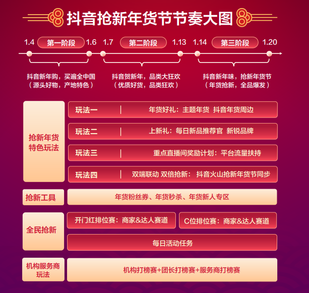 从2021年1月4日~1月20日,抖音电商将连续进行“抖音新年购,买遍全中国”、“抖音贺新年,品类大狂欢”、“抖音新年味,抢新年货节”三个阶段的年货节活动,以抢新年货特色玩法、抢新工具、全民抢新和机构服务商玩法,帮助用户玩转抖音抢新年货节。其中“年货好礼”是本次抖音年货节最具特色的活动,将会结合中国传统文化IP打造主题年货及周边,与商家机构共创新年味儿。