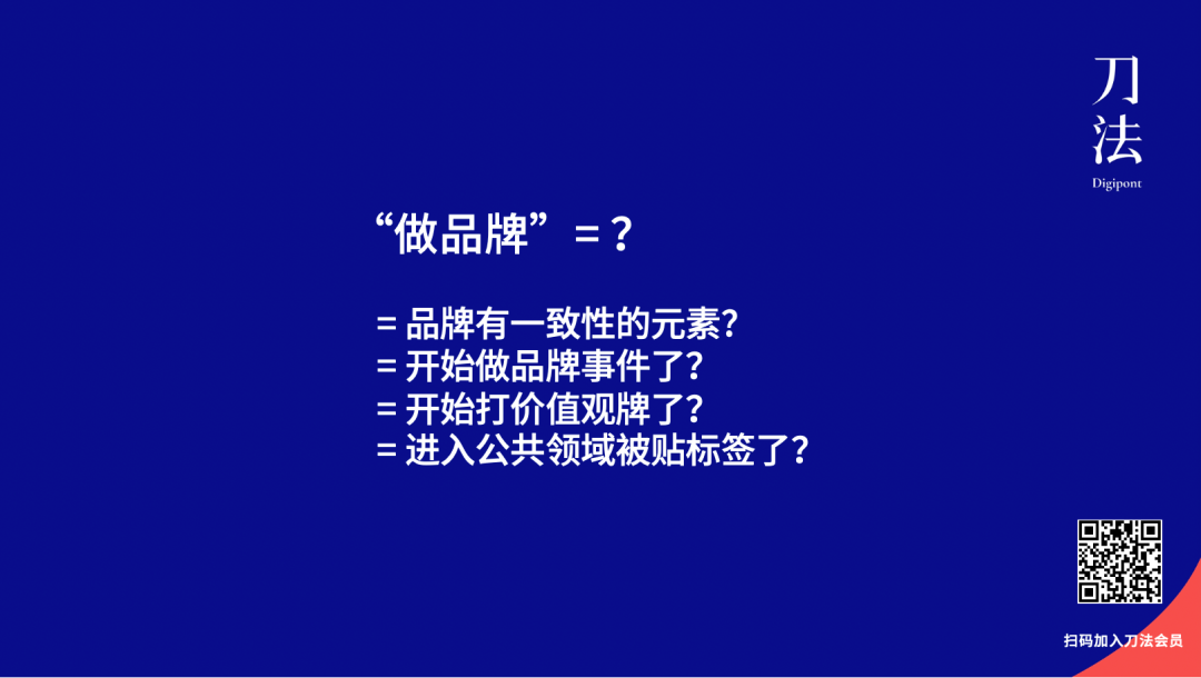 比如有些创始人说,做品牌要有一致性的元素;有些人说,做品牌前段时间要做获客、流量精准投放等,今年要开始做品牌事件,走入公众领域,被贴入公共标签了。还有人说,原来打功能牌,今年开始打“价值观”牌了。
