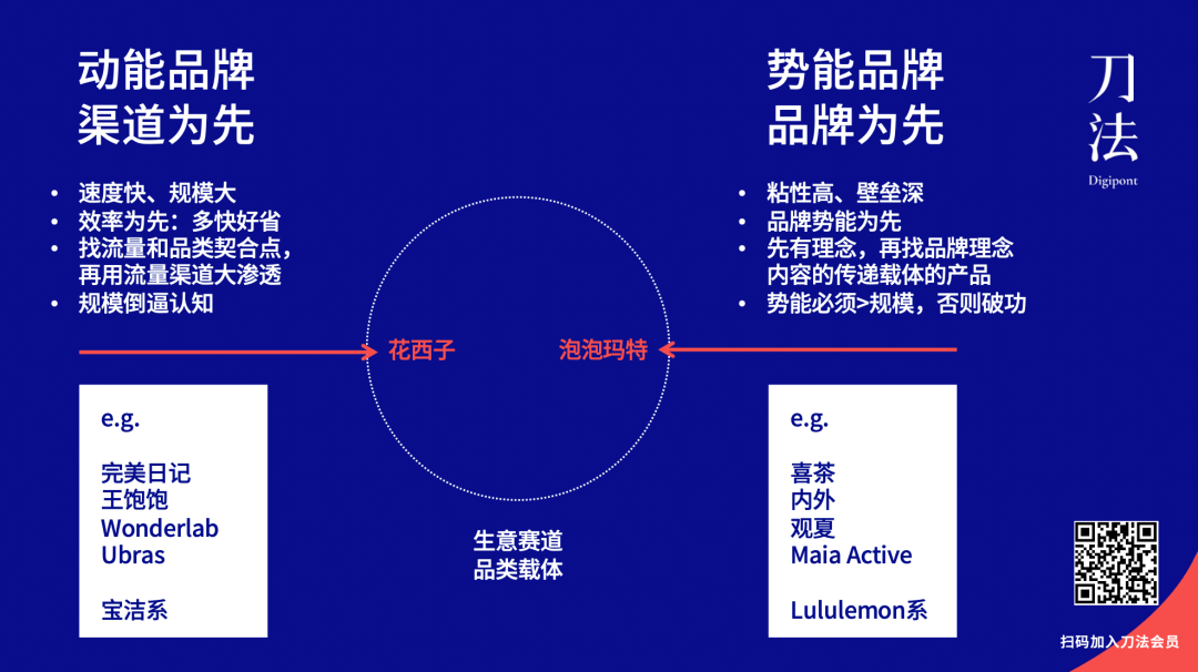 他们在我眼里是两种不同的品牌打法,左边一列我称为动能品牌,右边的是势能品牌。