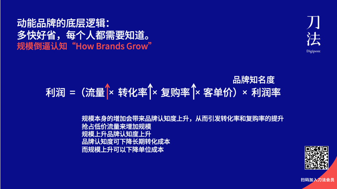 因此,动能品牌做增长的逻辑,就是自身规模的增加,会带来品牌认知整体地上升,引发转化率和复购率的提高。