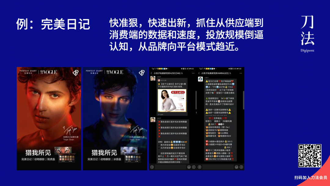 例如,完美日记就是快、准、狠,快速出新,抓住从供应端到消费端的数据和速度,在投放规模倒逼认知,最终他们会从品牌向平台模式趋近。今天我们会发现,完美日记微信群里开始卖羊毛衫、内衣等其它品牌的产品。