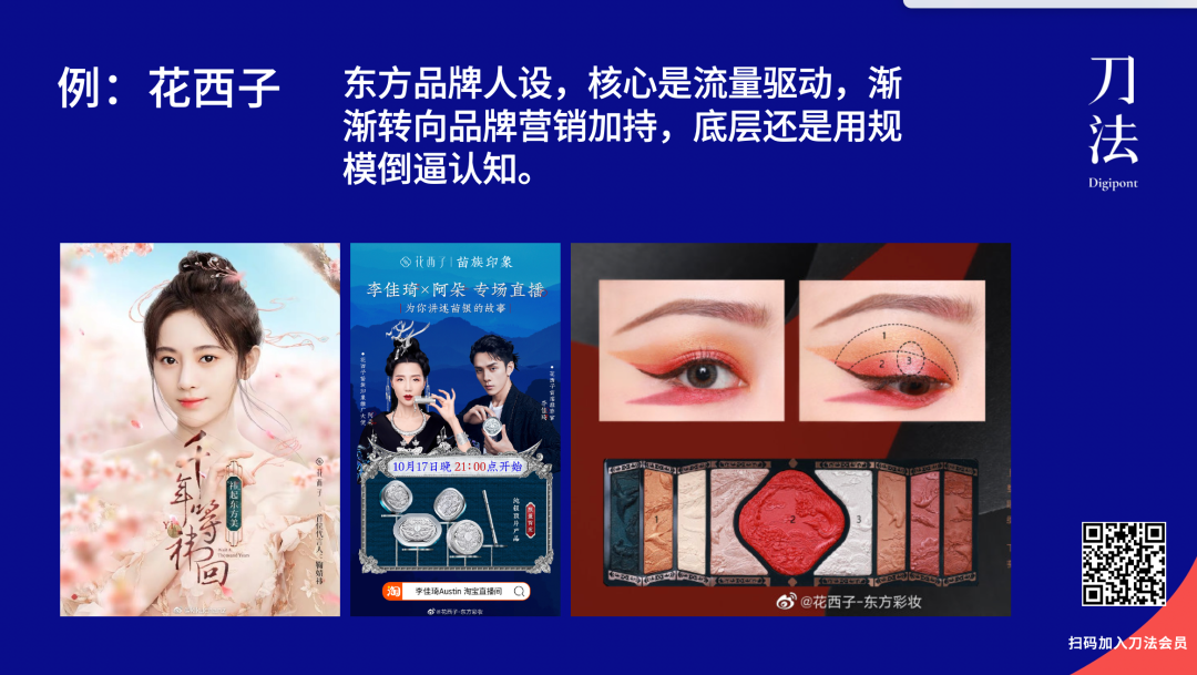 花西子也是如此,它是一个东方品牌人设。但它的底层增长逻辑,目前还是用流量来驱动,用规模倒逼认知。虽然它也渐渐开始往着势能方向走,用品牌营销加持,例如这次苗族印象就非常深入人心。