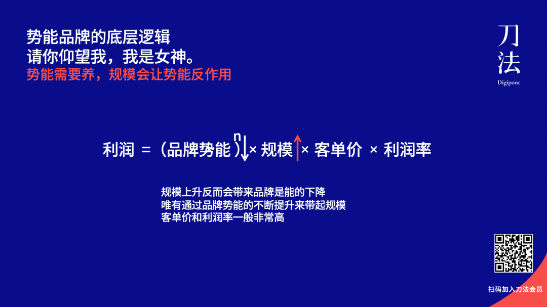所以,势能品牌的公式,是要用势能品牌的N次方,先把势能养到一定程度再做规模,规模上升反而会带来的是品牌势能的下降。唯有通过品牌势能的不断提升带起规模,客单价和利润率一般非常高。
