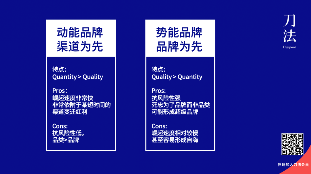 动能品牌是渠道为先,即以量取胜,好处就是崛起速度非常快,能在短时间内获得流量变迁的红利,通过渠道红利打造加速度。缺点就是抗风险低,即品类大于品牌。今天如果某个平台入局,做了某个品类的品牌,是不是有可能会压过动能呢?