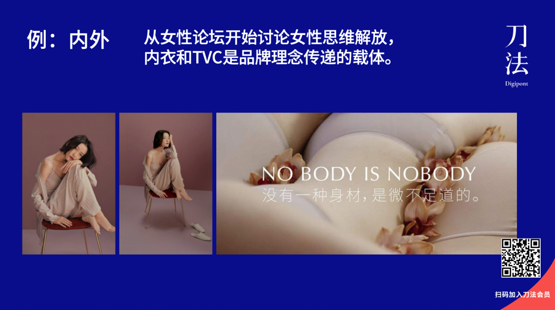 再比如说内外,内外一直都在传输女性思维解放,女性独立的理念,他们从2012年开始做女性论坛。接下来的内衣、内容,甚至是今年的Campaign的目的,想要达到的都不是一种效果,而是一种品牌理念传递的载体。