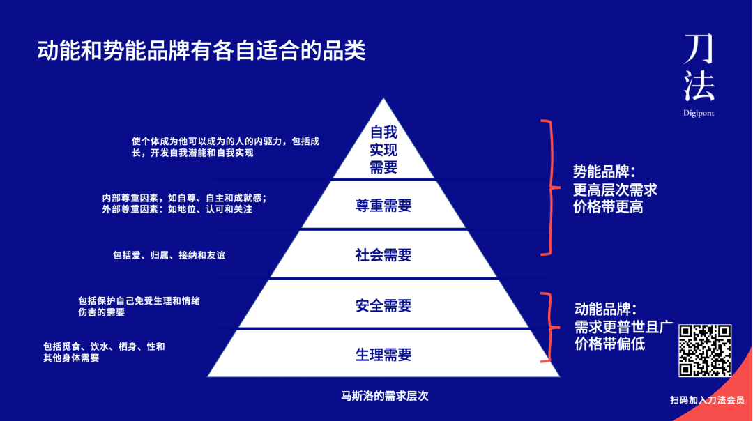 如果想要接近社会需要、尊重需要、自我实现需要,即主打爱、归属感、成就感、地位、内驱力等更高层次需求,则更容易出现价格带更高的势能品牌。