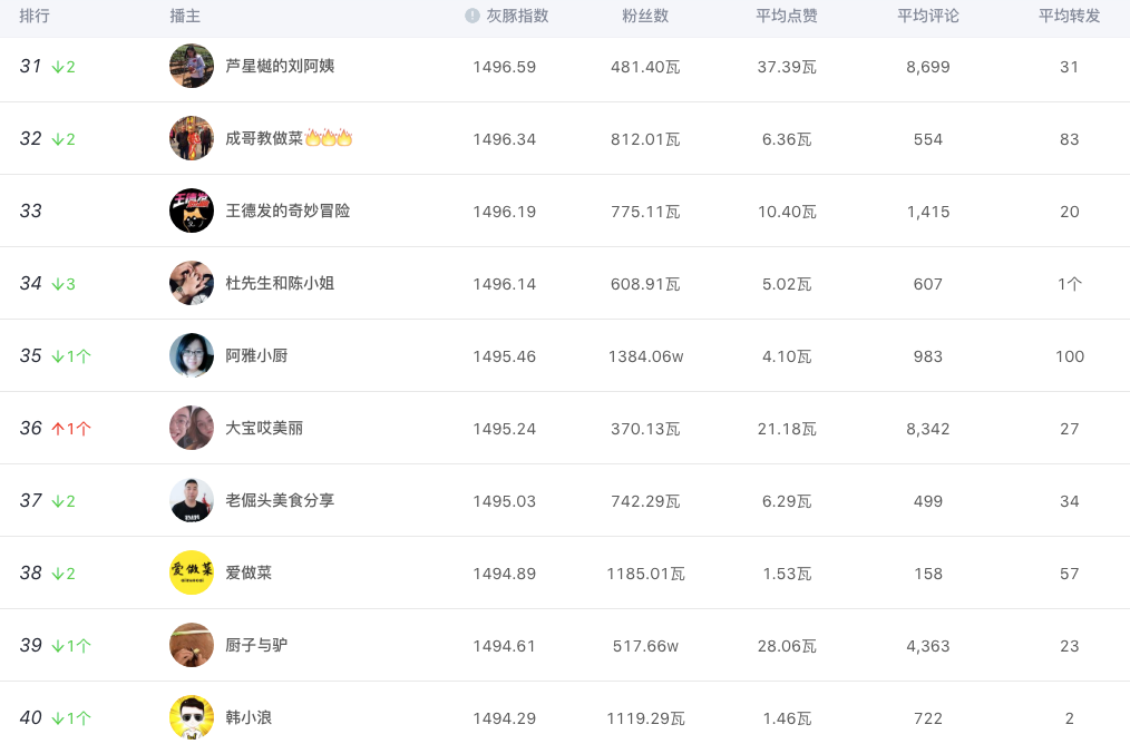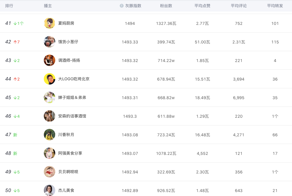 结合我们之前讲过的账号属性定位,我们以抖音【美食周榜】排名前50的账号为例,会发现排名靠前的,主要可以归纳为几个类别。