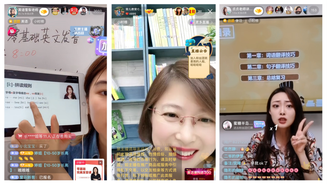 直播间(左:英语雪梨老师;中:育儿教育Coco老师;右:贞贞老师讲语文)