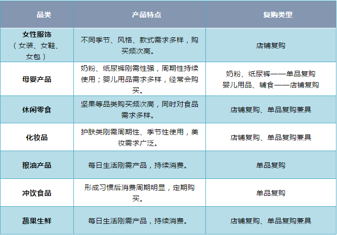 根据以上特征,我们认为以下产品品类,适合采取复购型策略: