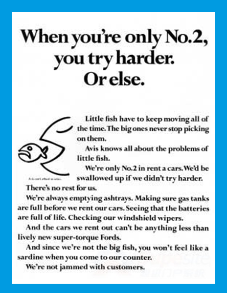 但是说实在的,从《定位》这本书上我获益不少。拿艾飞斯出租车来说,他们的文案写的是“当你只是第二,你会更努力”,完全契合人们对于“第二”的印象。从而打动人心。