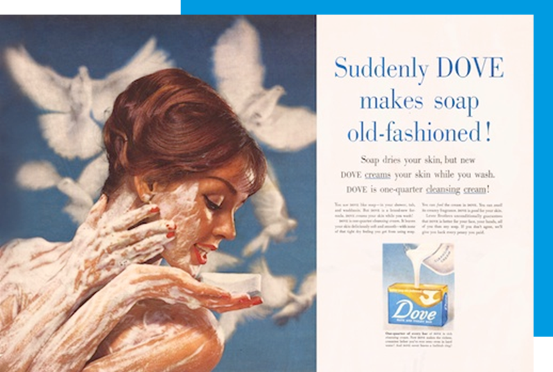 产品定位女性护肤,借用美女洗澡场景,文案为“新的洗浴香皂在沐浴时滋润您的肌肤”“多芬令您肌肤完美”等,成为经典之作。
