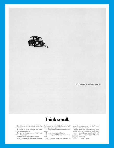 仔细读来,这些系列作品的创意点,都是“真实”的出发点。别人觉得丑、小,甲壳虫并没有反驳,而是全盘接受,并以此为切入点,开展相应的文案游说,“想想小的好”,“它很丑但是它能带你到想去的地方”“丑只是表象”“你因收入太高而不买它”等等,一张图、一个标题、一段文案,将大众所有被人诟病的点都转化为卖点,成功地解决了“在犹太城卖纳粹车”的问题。