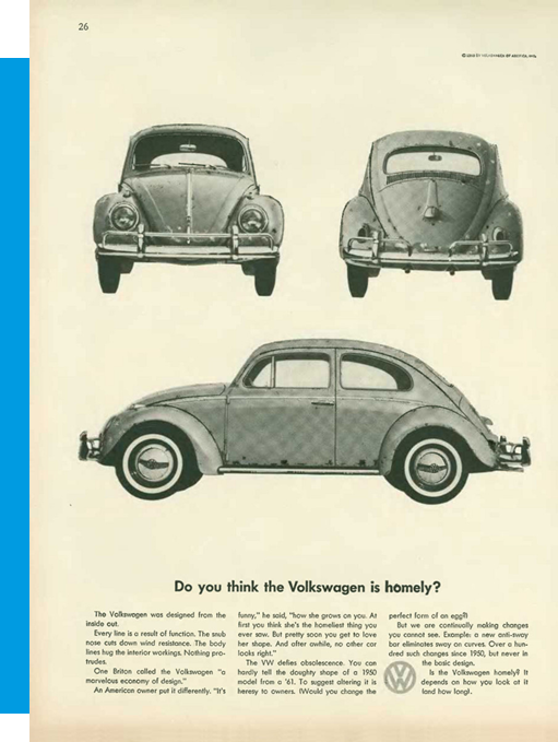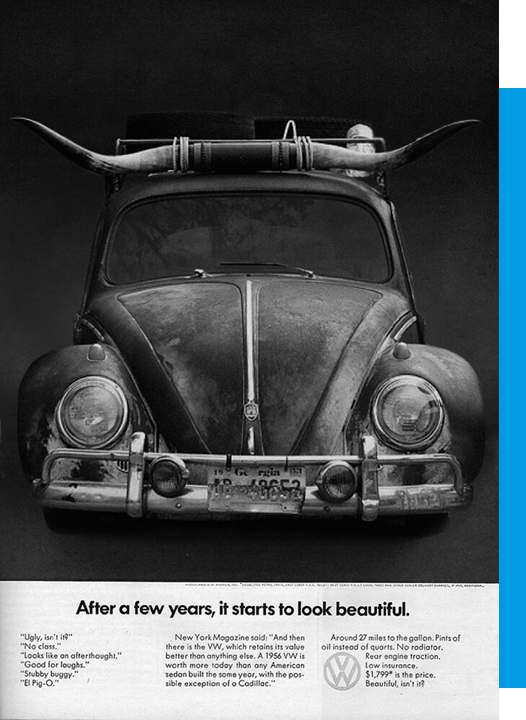 在我整个广告学习过程之中,如果让我为大师的案例做个排名,我一定首选“甲壳虫”系列作品。这套作品写了N多年,也不知是伯恩巴克的创意,还是乔治·路易斯的创意,也有可能是两位大佬在办公室共同迸发的灵感,文案撰稿是朱里安·柯尼格(Julian Koening),记住这个伟大的名字!
