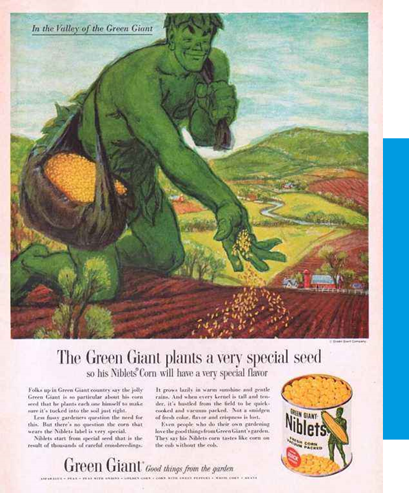 在最早给罐装豌豆的广告之中,李奥贝纳打造了一个巨大的绿色巨人,在夜深人静的时刻,他似乎要将月亮偷走一样,整个形象刻画了一个时刻都在进行光合作用的豌豆人,以极强的视觉冲击力给人留下深刻印象。《月光下的收成》是他为这个广告取的名字,文案配着“无论是日间或夜晚,绿巨人豌豆都在转瞬间选妥,风味绝佳——从产地到罐装不超过三小时。”