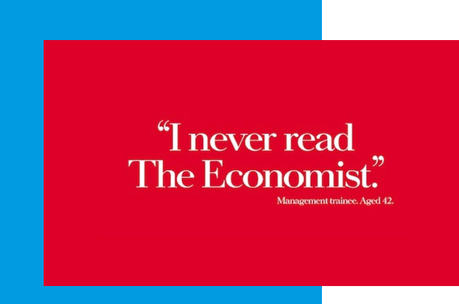 比方他为《经济学人》杂志写的文案:“我从来不看《经济学人》杂志——42岁的管培生。”通过一个特别极端例子,一个42岁从未升职的职场人视角,描述看《经济学人》的益处。平常的创意人,可能对这一命题的处理方式,是找一帮成功人士为其背书,都是正面表达,让商业老鸟说“我经常看经济学人”,从而达到传播效果。但是大卫·阿伯特偏不,他找了一个混不好的职场人代言,找他混不好的原因,竟然是从未读过《经济学人》,一下子可以击中平凡人不成功的心里归因,促使更多普通大众也对这本杂志感兴趣。很妙!