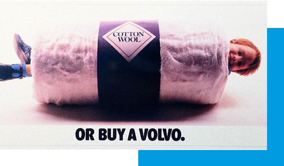 同样的案例,你可以看他为沃尔沃汽车做的一则广告,将一个孩子像糖一样裹起来,文案说“或者买辆沃尔沃。”言下之意是,不买沃尔沃,不够安全,就只能将自己的孩子像包粽子一样包起来。