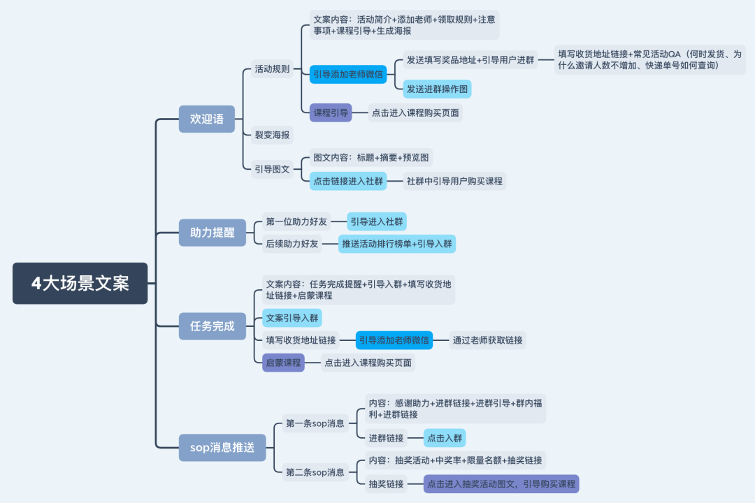本文会从欢迎语、助力提醒、任务完成提醒、sop消息推送,这4个环节来拆解,并总结出每个场景的文案模板,方便大家直接复用到自己的裂变活动中。