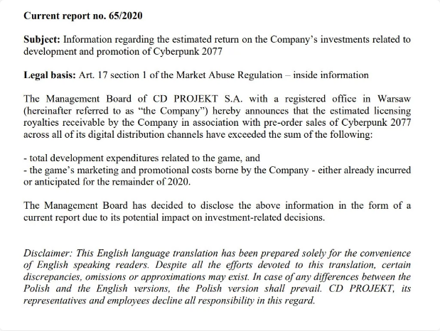 据CDPR官方报告,《赛博朋克2077》预购量和首发日销量已超过了其巨大的投入和市场宣传费,也就是说,《赛博朋克2077》仅用一天就回本盈利。