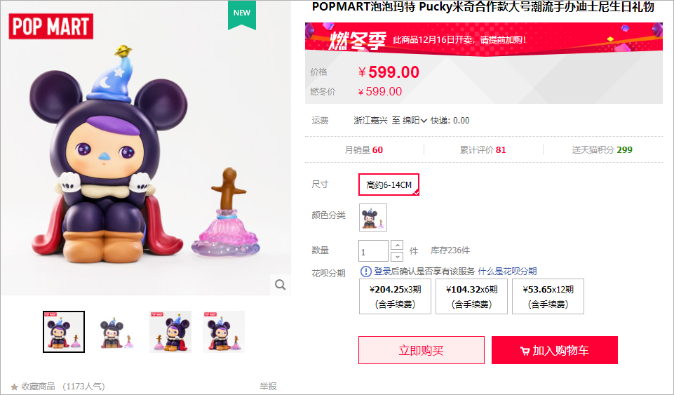 想要将用户带入到盲盒制造的这种惊喜营销中,品牌还是选择了低价的策略。在泡泡玛特的系列产品中,产品单价在59~599期间,不贵的入门款,因其萌趣炫酷的外表充满了吸引力。