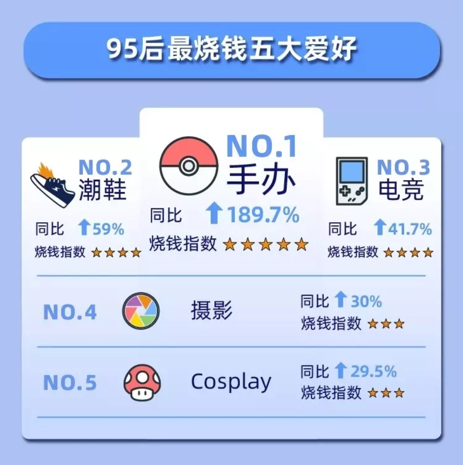 伴随着ACG成长起来的Z世代,由泛二次元市场衍生的盲盒是Z世代人群消费的代表之一。根据天猫《95后玩家剁手力榜单》显示,潮玩手办以187%的增长速度,位于95后最烧钱的五大爱好之首。