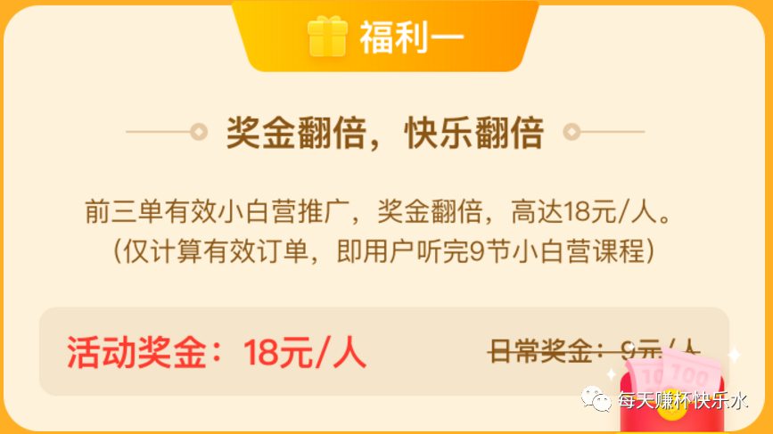 比如,小白课程,推广出去新用户0元就能学习,正常情况老用户拿到9元奖励。