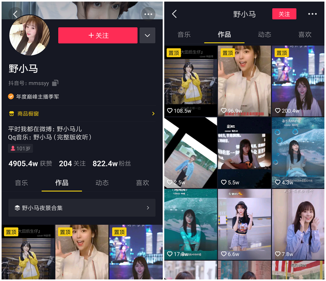 我们看抖音上这个叫做“野小马”的达人,她的账号定位就是唱歌。