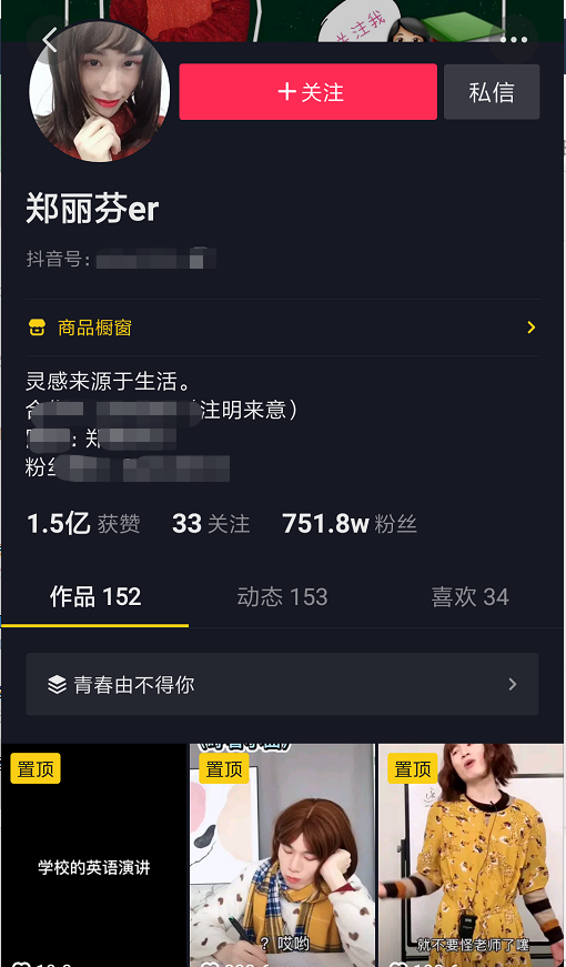 点进她的主页查看,每一个视频都是在唱歌,除了场景和服装发生了变化,视频的主体内容是保持不变的。