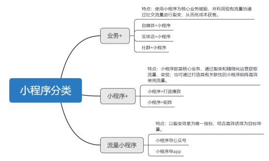 业务+类型中,小程序围绕着微信流量池开展核心业务,通过结合小程序达成支付、裂变、线上化等目的。