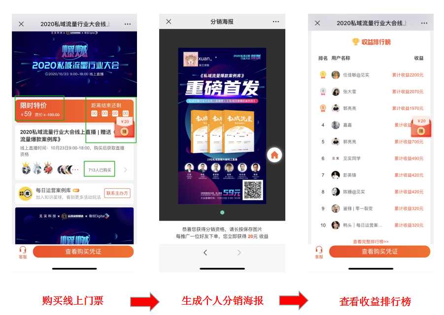 用户付费后通过个人分销海报可获得收益(20元/人),金钱的刺激让用户产生行动。海报转发通过熟人间的相互推荐产生了外部触发进行大量传播,而收益排行榜有清晰的邀请数量记录和提醒,会激起种子用户的挑战欲、荣誉感和成就感,从而增加转介绍。