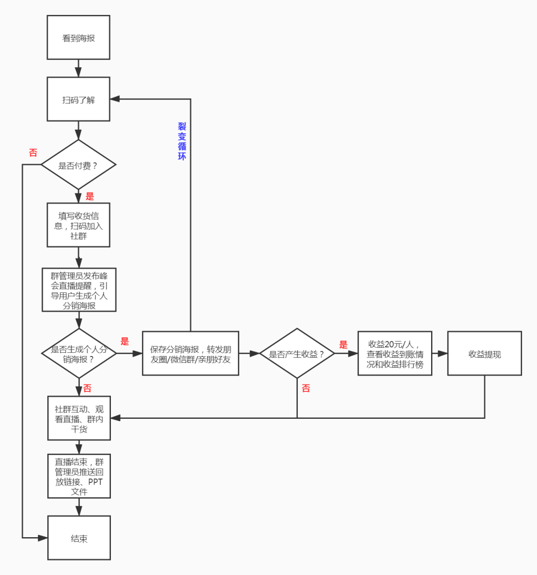 再对用户分成线上社群管理和线下社群管理,保证现场用户的秩序和线上用户的体验感。以往参加的活动都是线下活动(毕竟线下活动已经耗费了大量的人力和物力),线上直播同样采用海报分销的方式,提高了观看大会的人气值可作为学习。