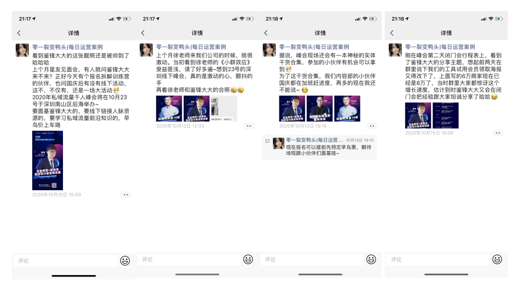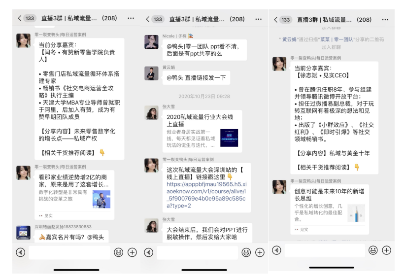 把用户沉淀到社群和个人号上,社群引导用户进行个人裂变,提高转化率。直播过程中实时播报分享嘉宾信息和干货分享,保证社群活跃度,提高用户的观看体验感。