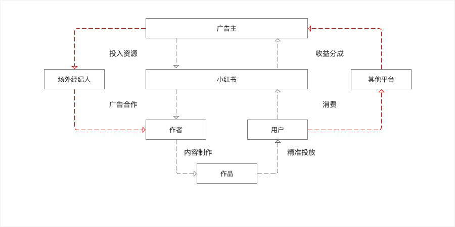 正如上图红色业务流所构成的闭环,金主爸爸通过场外经纪人+小红书的混合模式投放商业推广,成本更低;而通过其他平台的电商收入分成,收益更高。这就是商业品牌市场人员眼中的小红书,低ROI。