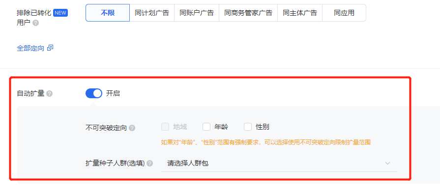 多说一句,这是一个极容易出问题的地方,有些公司对地域有明确要求,优化师在定向时也设置了地域定向,但开了自动扩量,就很容易造成赔付。