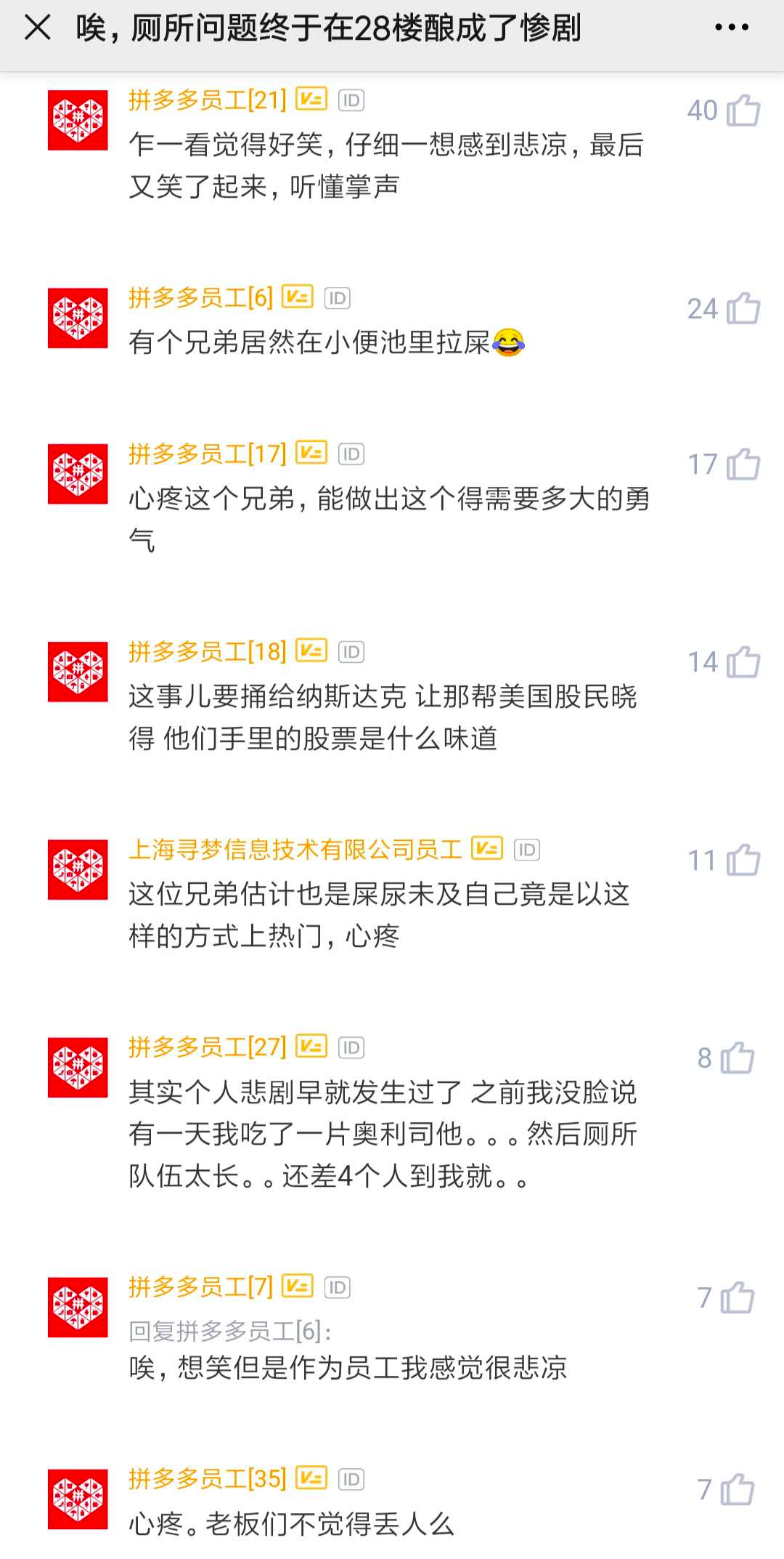 互联网是有记忆的,光说拼多多,「厕所门」事件这才过了多久?有人把这种事当成段子,甚至还想着火一把,这都是源于深层次畸形的企业价值观。拼多多加班严重,这本来就是公开的秘密,社畜就连上厕所的自由也是奢侈。