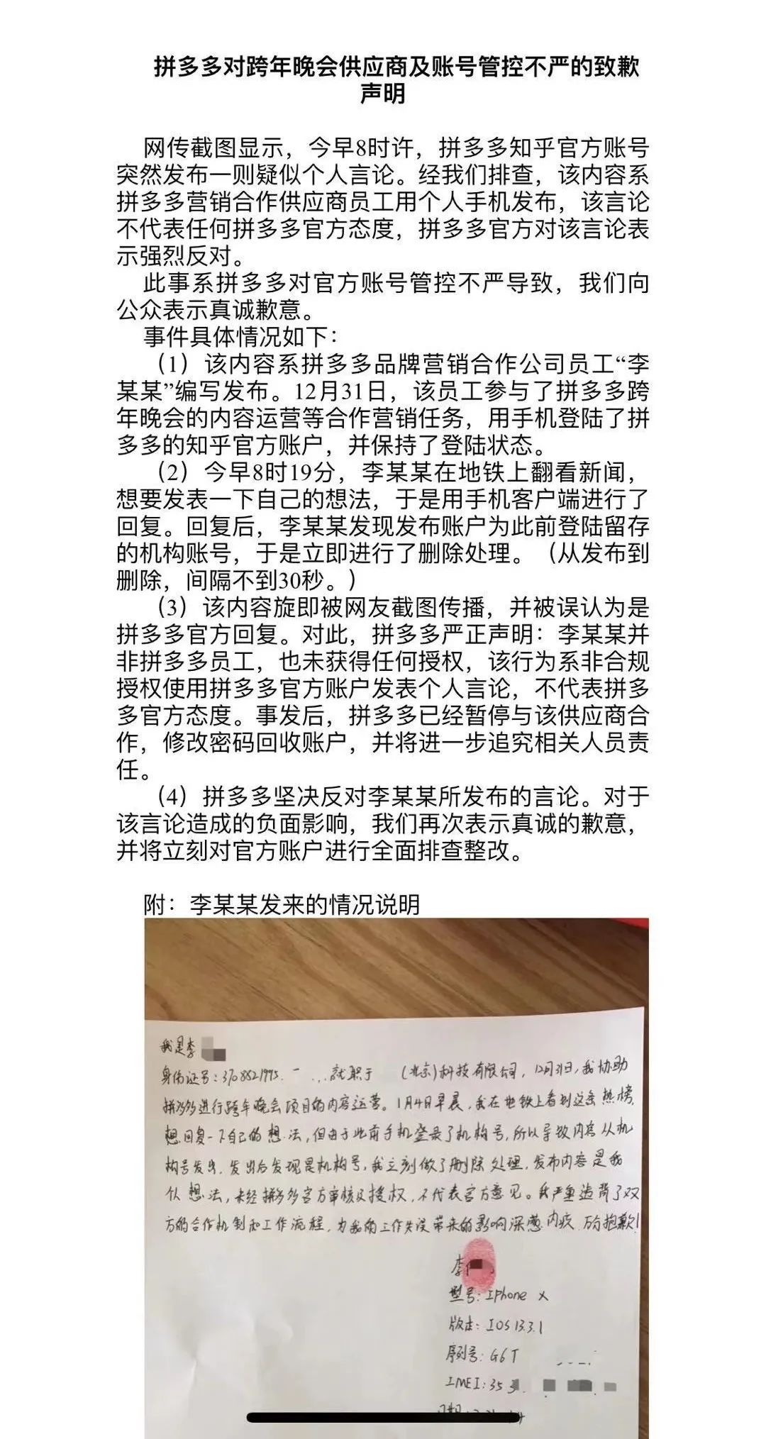 在这次事件里,拼多多官方并未仔细排查原因的情况下,就发布了第一份准确性有误的声明,第二份补救的声明更是有点「狗急跳墙」的味道。直接以word形式开始在各大社群传播,没有公章,没有落款,真假不明……这显然不应该是一家上市公司公关部门的水平。