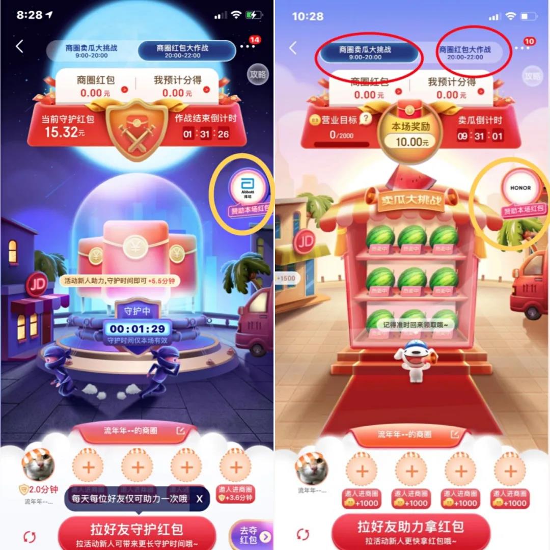 第二种玩法组商圈拿红包,这里根据不同的时间段设置2种不同的玩法,一个集中白天(商圈卖瓜大挑战),一个集中在晚间(商券红包大作战)用户可以根据自己的时间安排选择参与,时间上可以满足不同的用户群体;