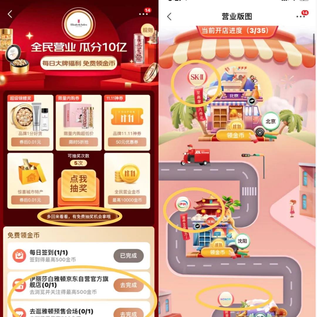 你可以思考他是怎么引导用户点击的,比如抽奖的形式,营业版图按钮上的"可领金币",任务按钮上方的任务的直接提示,每个品牌都以商品进行展示并写上满减赠礼等吸引点击等;